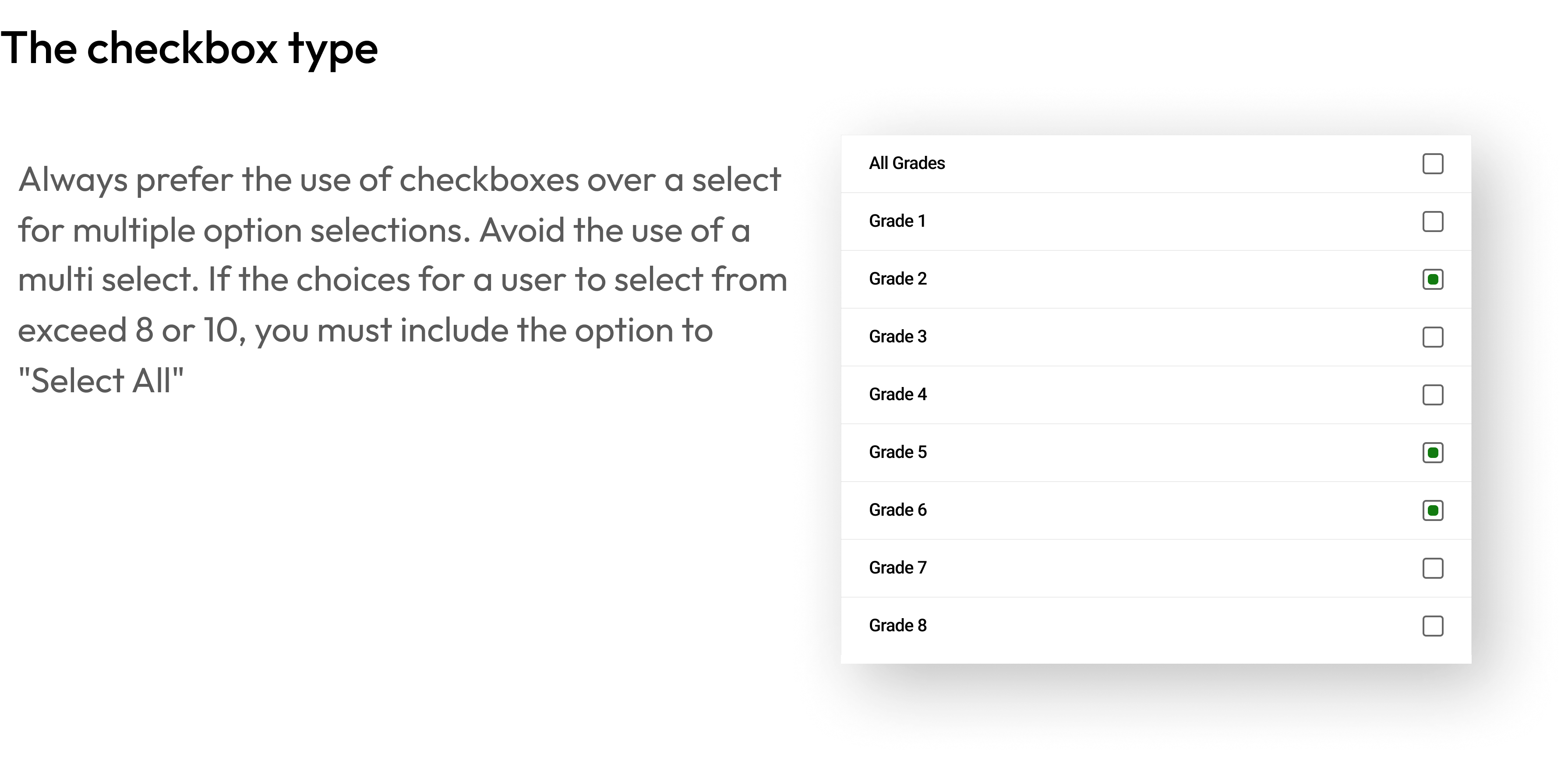 Always prefer the use of checkboxes over a select for multiple option selections. Avoid the use of a multi select. If the choices for a user to select from exceed 8 or 10, you must include the option to "Select All"