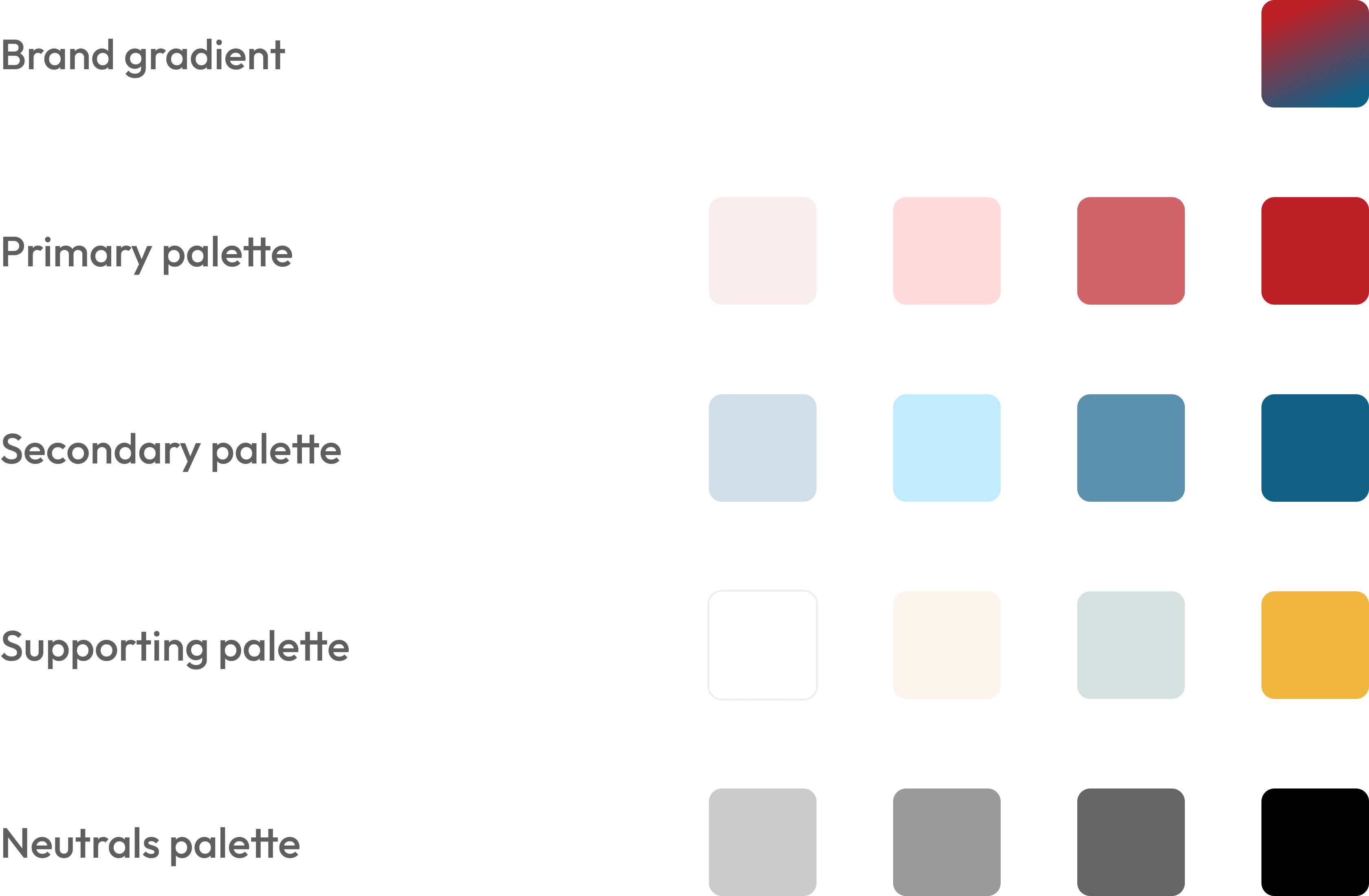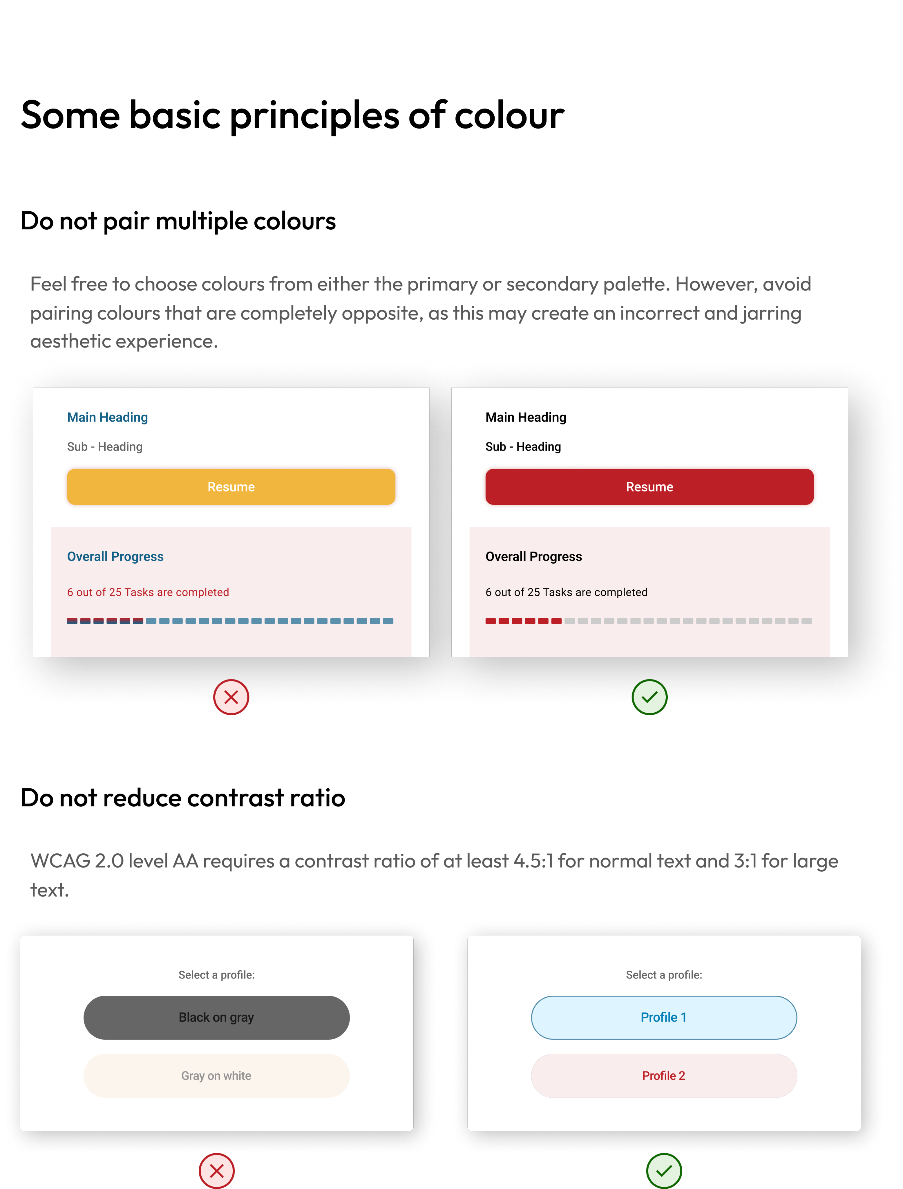 Feel free to choose colours from either the primary or secondary palette. However, avoid pairing colours that are completely opposite, as this may create an incorrect and jarring aesthetic experience.