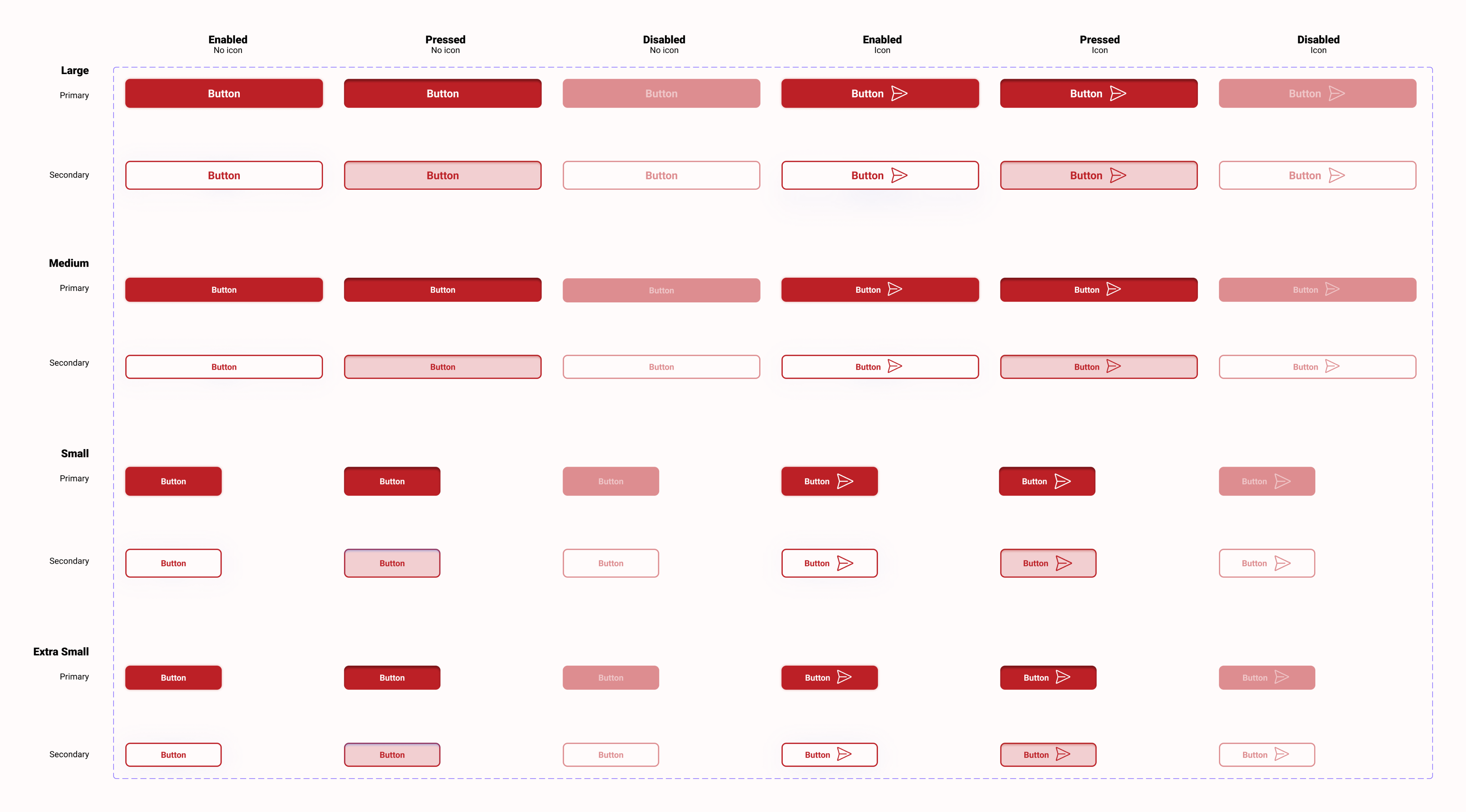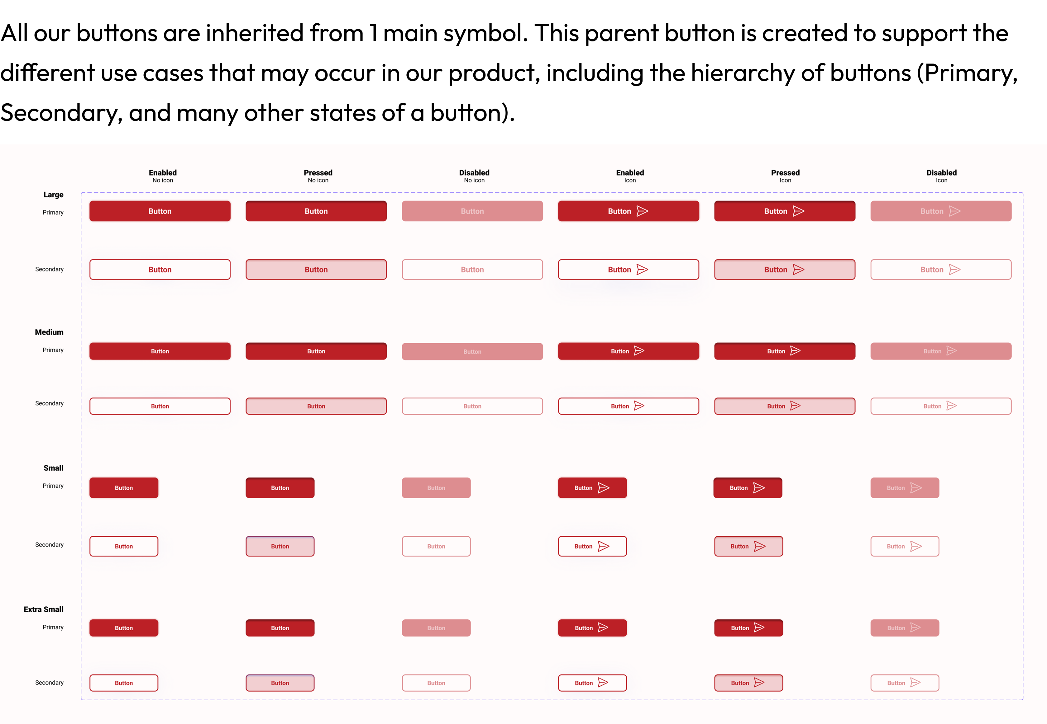 All our buttons are inherited from 1 main symbol. This parent button is created to support the different use cases that may occur in our product, including the hierarchy of buttons (Primary, Secondary, and many other states of a button).