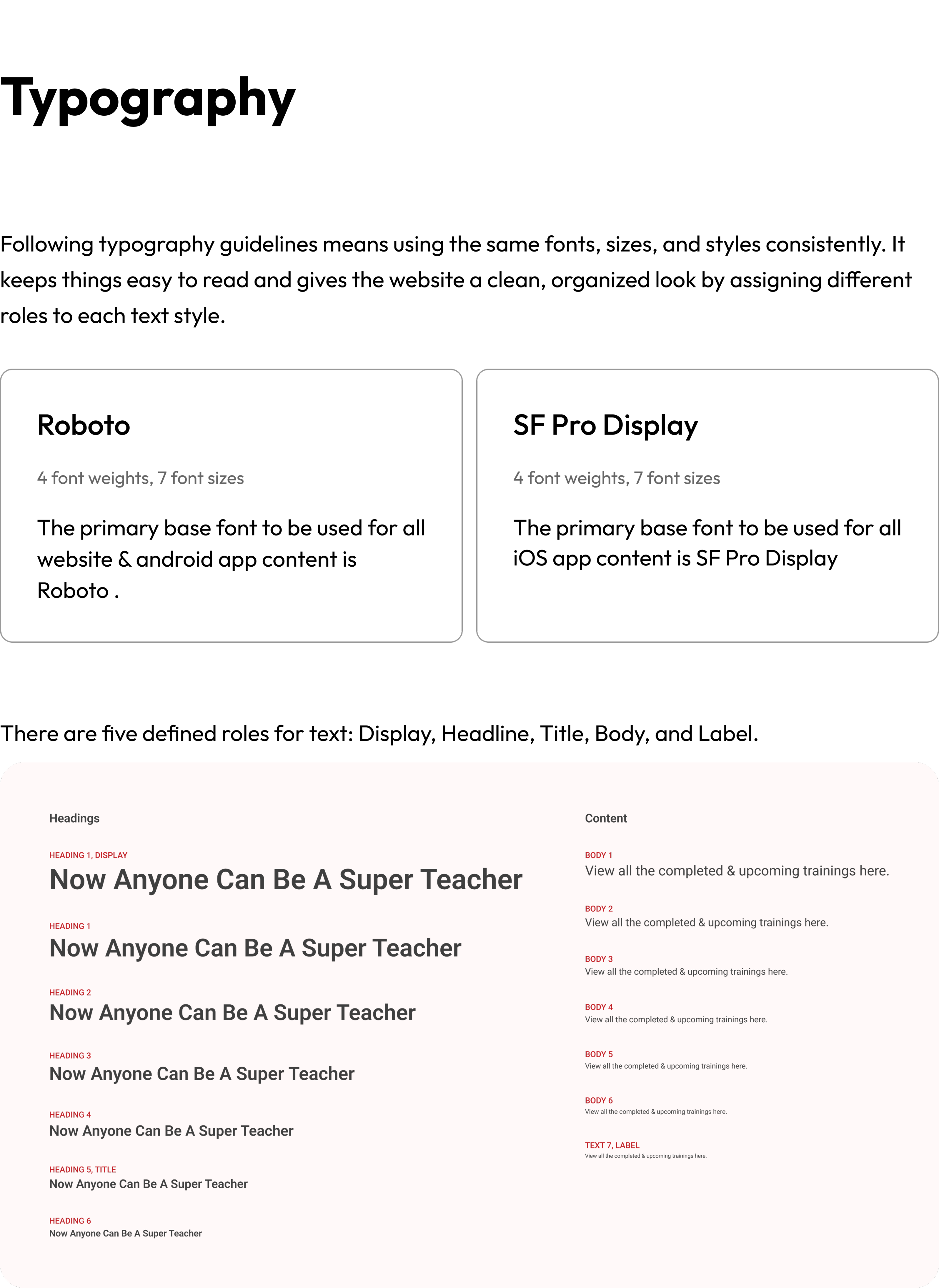 There are five defined roles for text: Display, Headline, Title, Body, and Label.