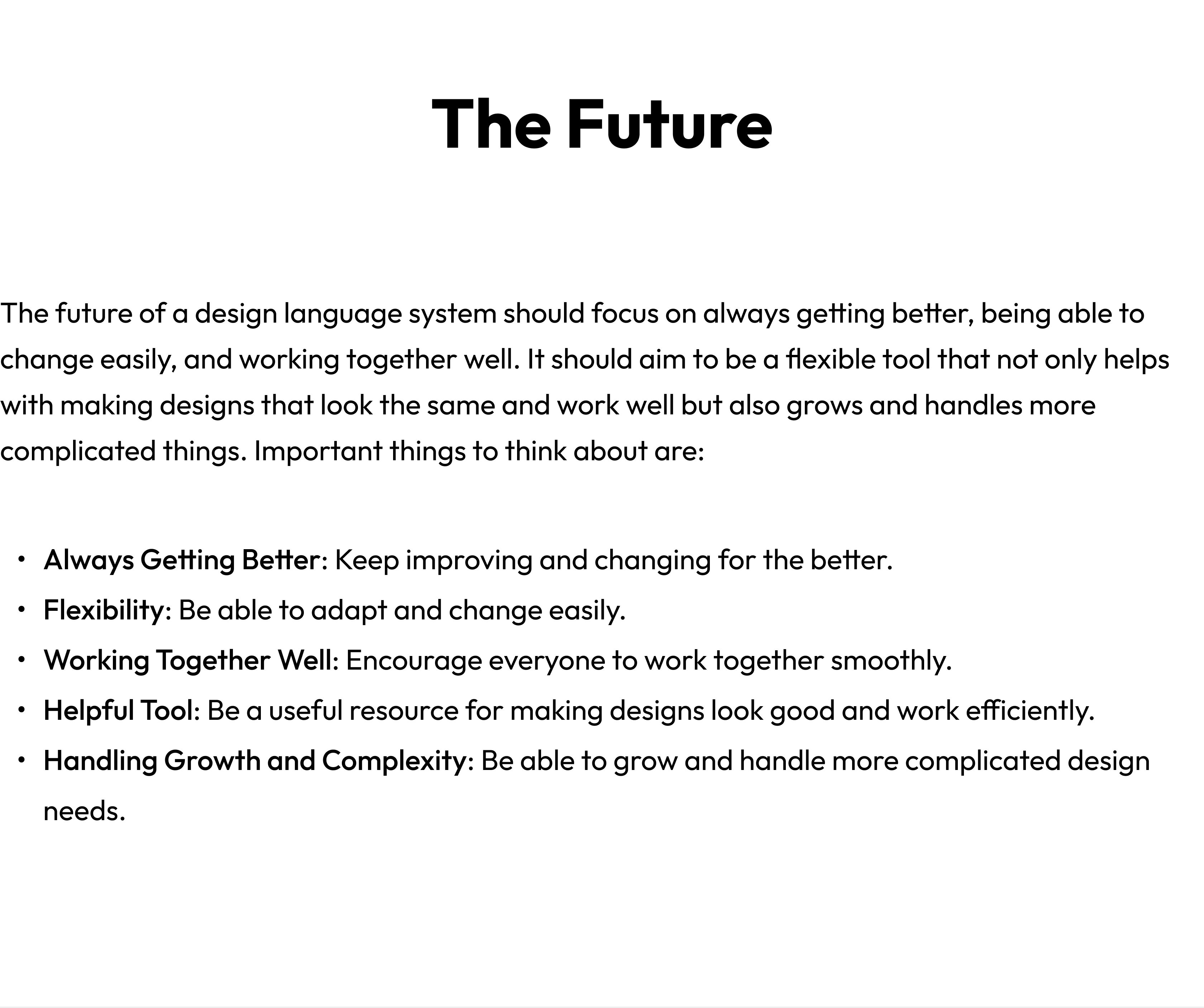 The future of a design language system should focus on always getting better, being able to change easily, and working together well. It should aim to be a flexible tool that not only helps with making designs that look the same and work well but also grows and handles more complicated things. Important things to think about are: