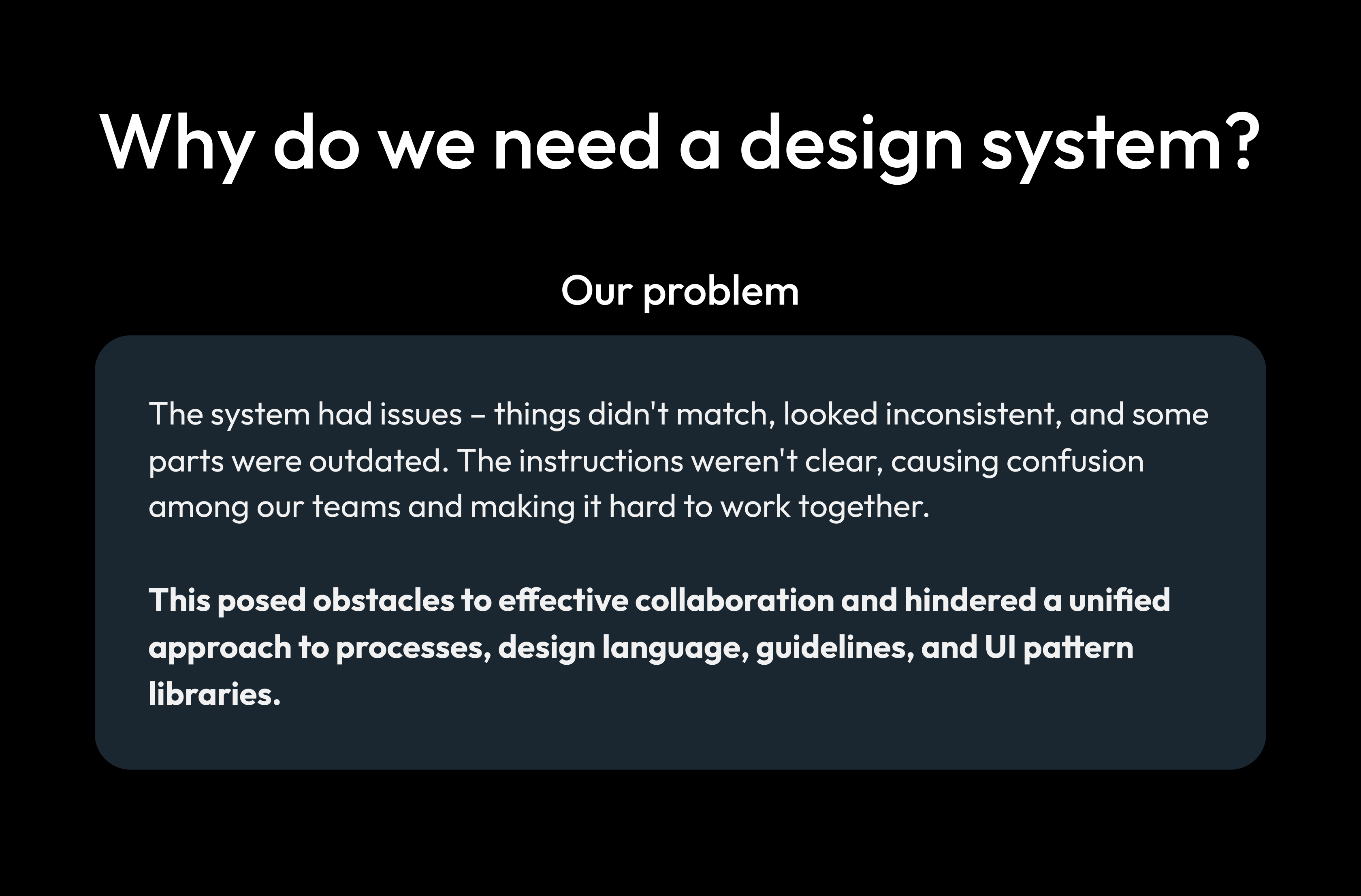 This posed obstacles to effective collaboration and hindered a unified approach to processes, design language, guidelines, and UI pattern libraries.